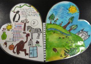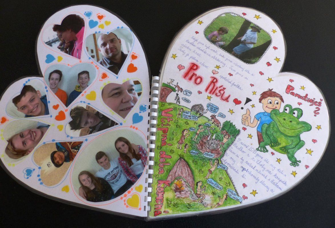 K myšlence vytvořit pro Ríšu knížku nás přivedla právě výzva Srdce s láskou darované a nápad se zdál skvělý až do momentu, kdy jsme začali přemýšlet, o čem vlastně psát. ‚Napišme, namalujme a vytvořme to, co bychom si přáli číst, kdybychom se ocitli sami,‘ motivovali jsme se navzájem. Pro inspiraci jsem stvořila ilustrovanou prázdninovou příhodu, děcka se hned chytla a už to jelo. Vzpomínky na společné vylomeniny, novinky a průšvihy ze třídy, doplňovačka, šílené vtipy, krátké komiksy, obrázky a fotky… Tvořili psavci i ti, kterým jsou hodiny slohu nebo výtvarky z duše protivné.