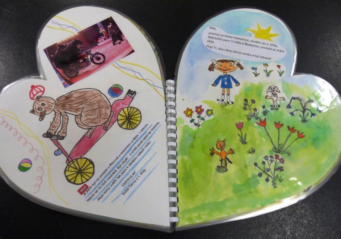 Na podzim jsme ve výtvarném kroužku tvořili do soutěže Srdce s láskou darované již třetí srdce. Děti pracovaly jako v předešlých letech tvořivě, svědomitě, ale řekla bych, že s větším nasazením a zodpovědností. Každý chtěl mít svou stránku nejpěknější. Vždyť vyráběly srdce pro Ríšu, který před rokem tvořil s nimi. Proto musela být srdcová knížka super! A to mě dostalo. Víte, já si k těm dětem chodím ‚dobít baterky‘. Čistota dětských srdíček, radost z tvoření, jásavá radost z výhry, to je balzám pro každou kantorskou duši, to je moje největší odměna. Říká se, že zlo plodí zlo, dobro plodí dobro. Kdo zasévá radost, sklízí radost.